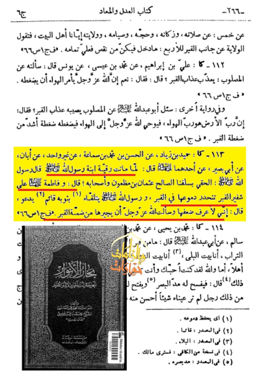حميد بن زياد، عن الحسن بن محمد بن سماعة، عن غير واحد، عن أبان، عن أبي بصير، عن أحدهما عليهما السلام قال: لما ماتت رقية ابنة رسول الله صلى الله عليه وآله قال رسول الله صلى الله عليه وآله: الحقي بسلفنا الصالح عثمان بن مظعون وأصحابه، قال: وفاطمة عليها السلام على شفير القبر تنحدر دموعها في القبر، ورسول الله صلى الله عليه وآله بتلقاه (1) بثوبه قائم (2) يدعو، قال: إني لأعرف ضعفها وسألت الله عز وجل أن يجيرها من ضمة القبر. ” ف ج 1 ص 66