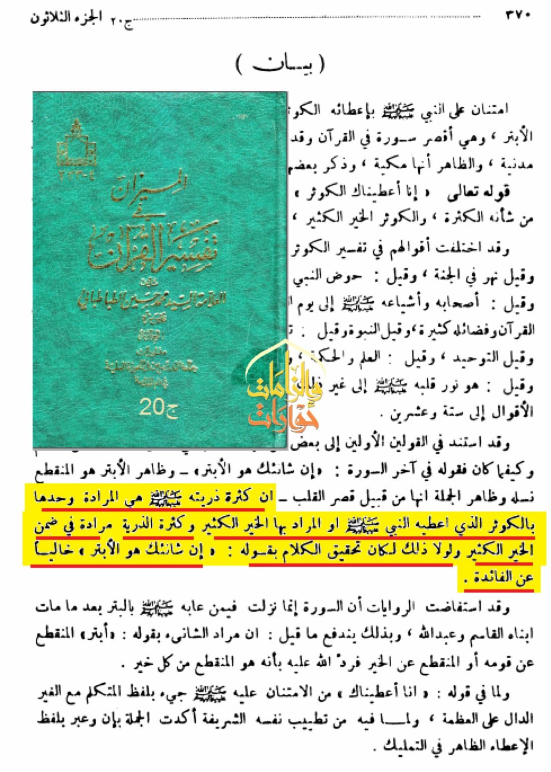 ان كثرة ذريته صلى الله عليه وآله وسلم هي المرادة وحدها بالكوثر الذي أعطيه النبي صلى الله عليه وآله وسلم أو المراد بها الخير الكثير وكثرة الذرية مرادة في ضمن الخير الكثير ولولا ذلك لكان تحقيق الكلام بقوله: ” إن شانئك هو الأبتر ” خاليا عن الفائدة.