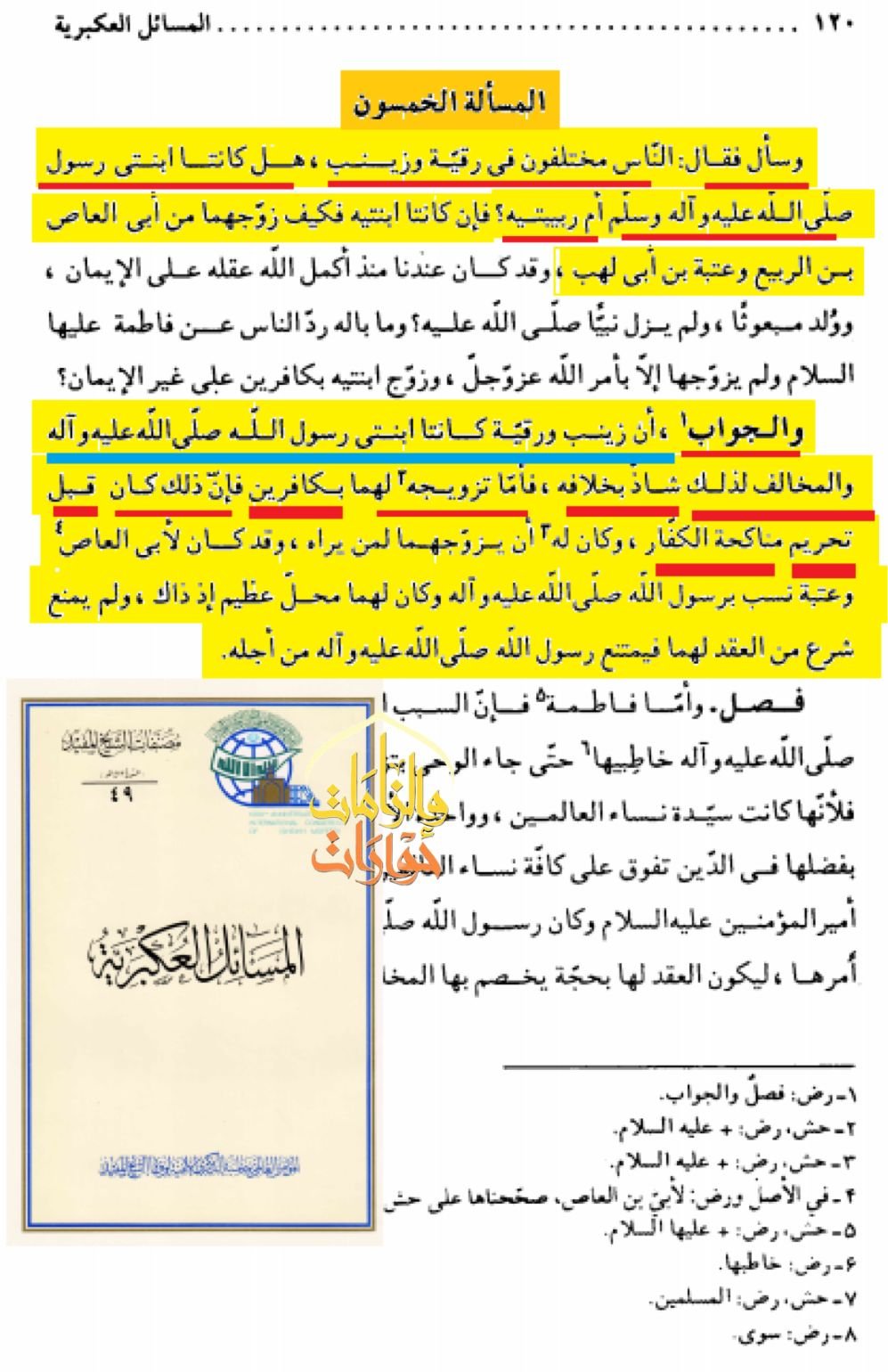 المسألة الخمسون وسأل فقال: الناس، مختلفون في رقية وزينب، هل كانتا ابنتي رسول صلى الله عليه وآله وسلم أم ربيبتيه؟ فإن كانتا ابنتيه فكيف زوجهما من أبي العاص بن الربيع وعتبة بن أبي لهب،وقد كن عندنا منذ أكمل الله عقله عليه الإيمان، وولد مبعوثا، ولم يزل نبيا صلى الله عليه؟ وما باله رد الناس عن فاطمة عليها السلام ولم يزوجها إلا بأمر الله عز وجل، وزوج ابنتيه بكافرين على غير الإيمان؟