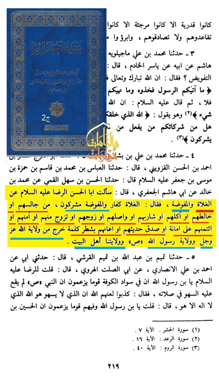 سألت أبا الحسن الرضا عليه السلام عن الغلاة والمفوضة فقال: الغلاة كفار والمفوضة مشركون من جالسهم أو خالطهم أو آكلهم أو شاربهم أو واصلهم أو زوجهم أو تزوج منهم أو آمنهم أو ائتمنهم على امانة أو صدق حديثهم أو أعانهم بشطر كلمة خرج من ولاية الله عز وجل وولاية رسول الله (ص) وولايتنا أهل البيت.