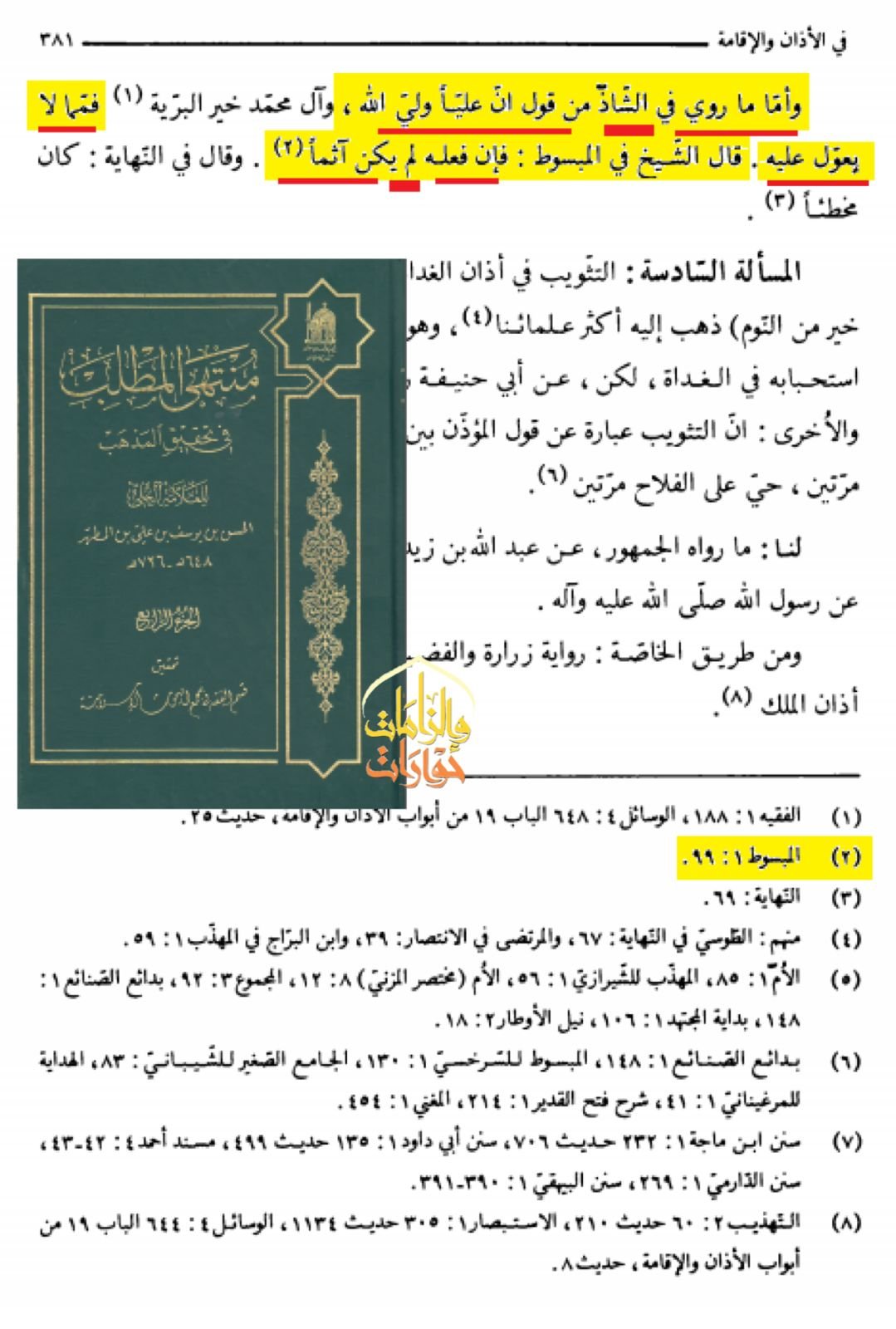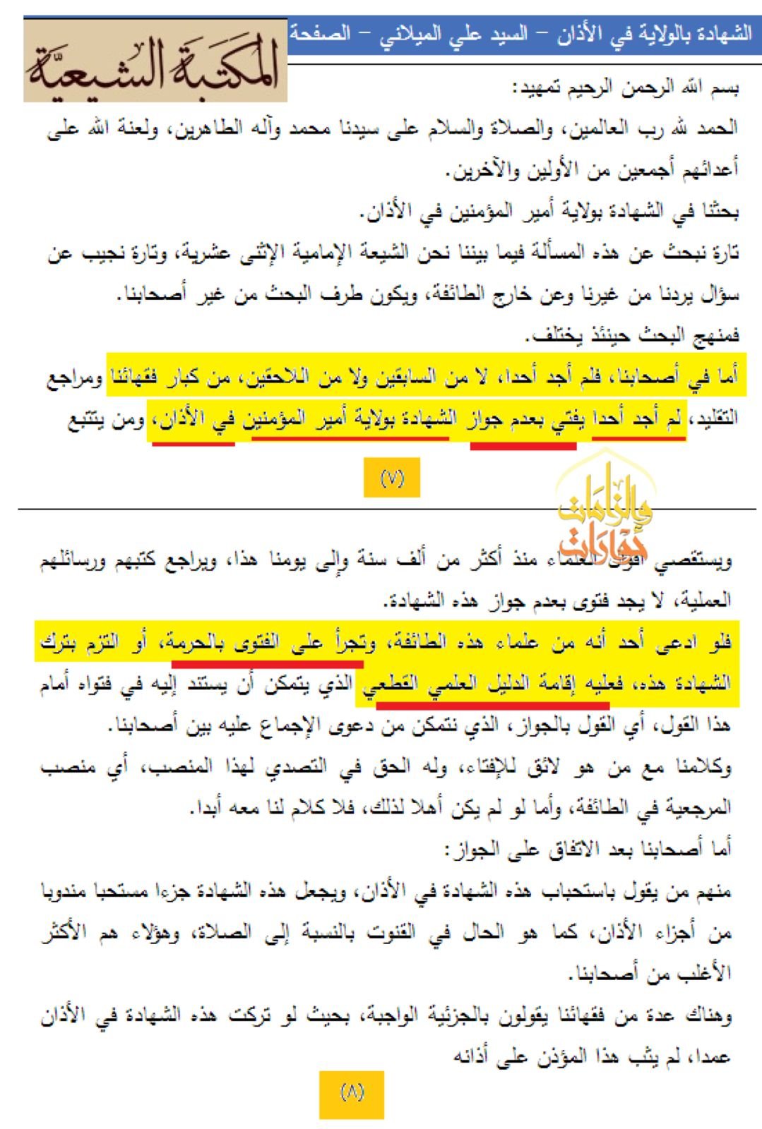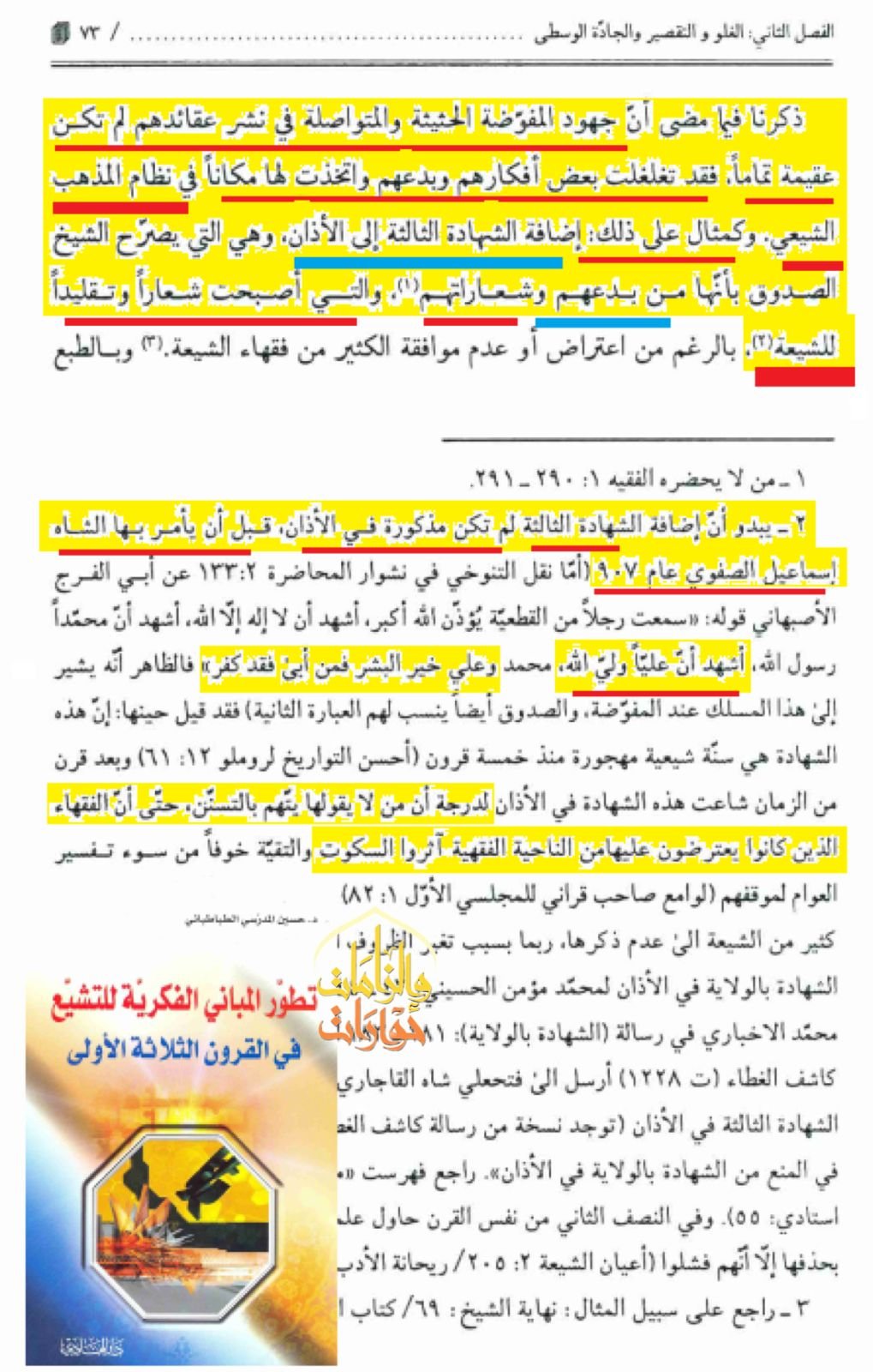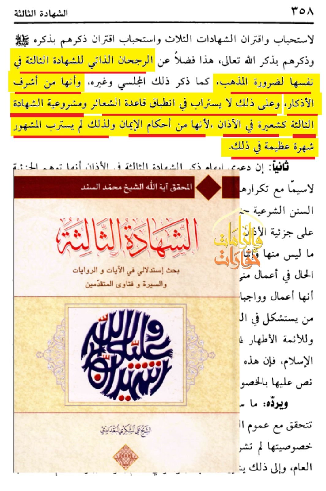 “وبعدَ كلِّ هذا، فإنَّ علماءَ الشيعةِ قد اختلفوا في سُنِّيَّةِ هذه الشهادةِ الثالثةِ أو بِدعيَّتِها، فالأقلُّ القليلُ قال بأنَّها سُنَّةٌ، وهؤلاءِ أكثرُهم من المتأثِّرين، وأمّا جمهورُ الشيعةِ فقد قالوا بِبِدعيَّةِ هذه الشهادةِ الثالثةِ في الأذانِ، وإليكَ الوثائقَ التي تُثبِتُ تناقضَهم في ذلك: