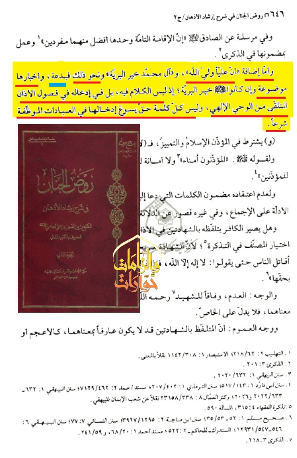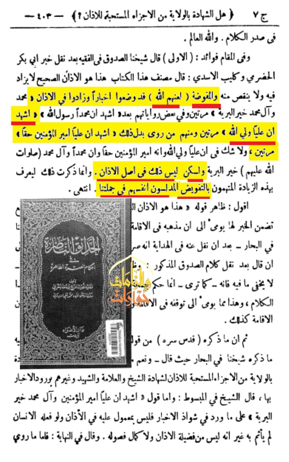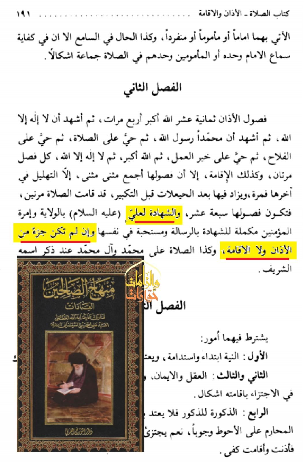 “وبعدَ كلِّ هذا، فإنَّ علماءَ الشيعةِ قد اختلفوا في سُنِّيَّةِ هذه الشهادةِ الثالثةِ أو بِدعيَّتِها، فالأقلُّ القليلُ قال بأنَّها سُنَّةٌ، وهؤلاءِ أكثرُهم من المتأثِّرين، وأمّا جمهورُ الشيعةِ فقد قالوا بِبِدعيَّةِ هذه الشهادةِ الثالثةِ في الأذانِ، وإليكَ الوثائقَ التي تُثبِتُ تناقضَهم في ذلك: