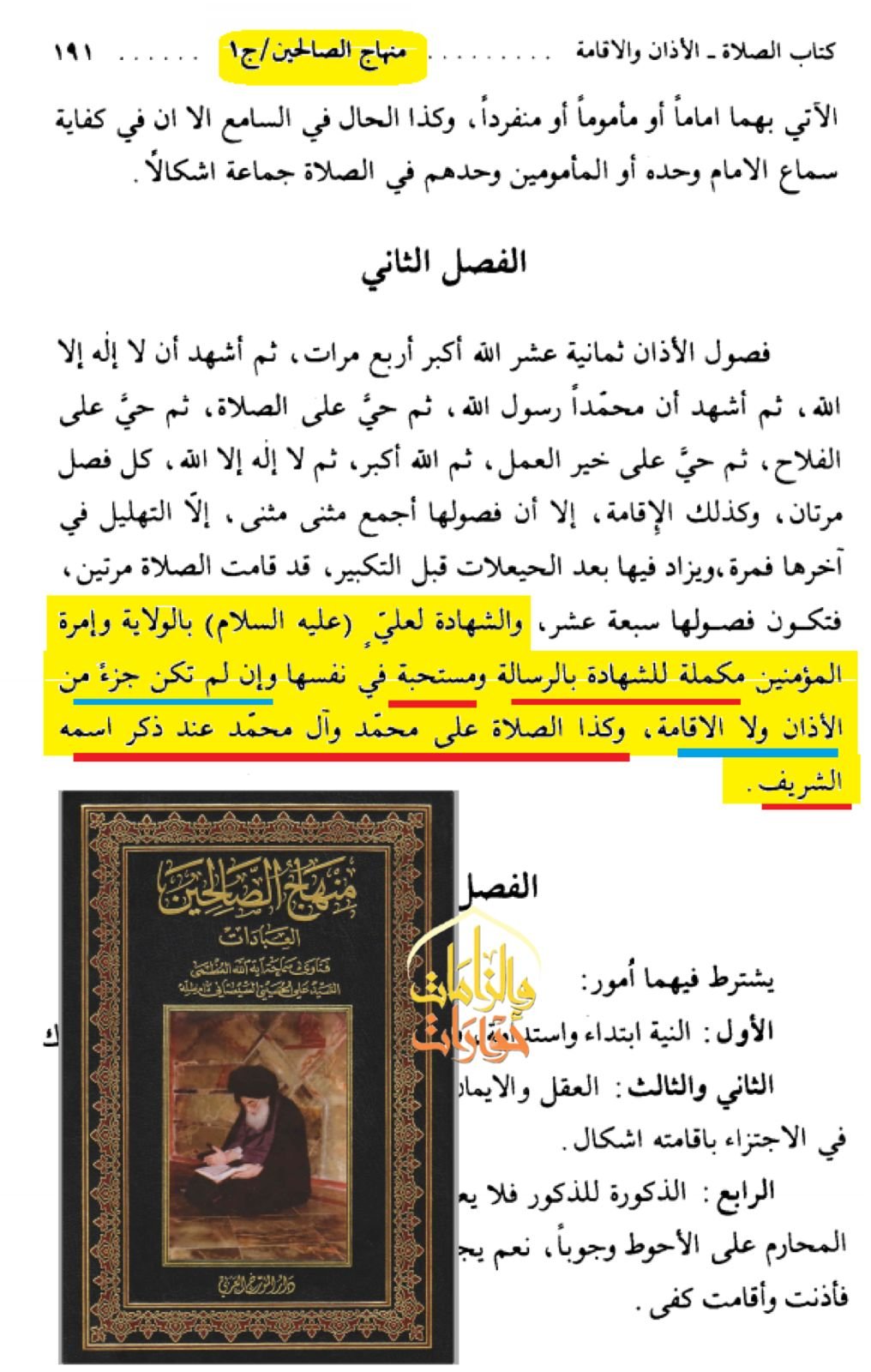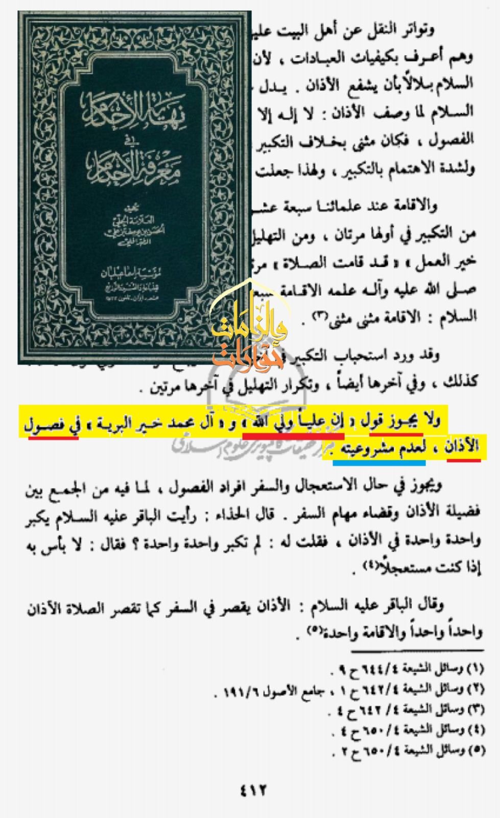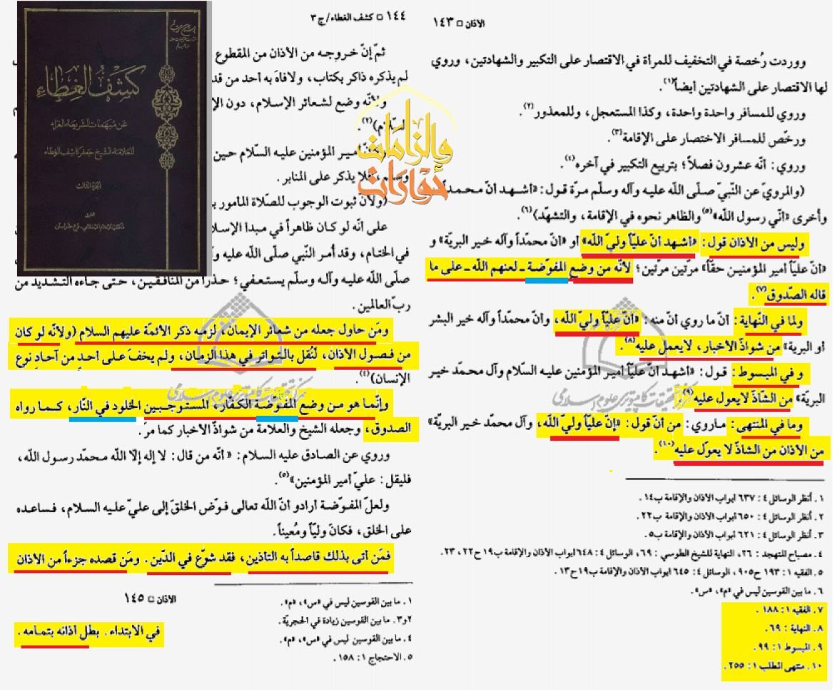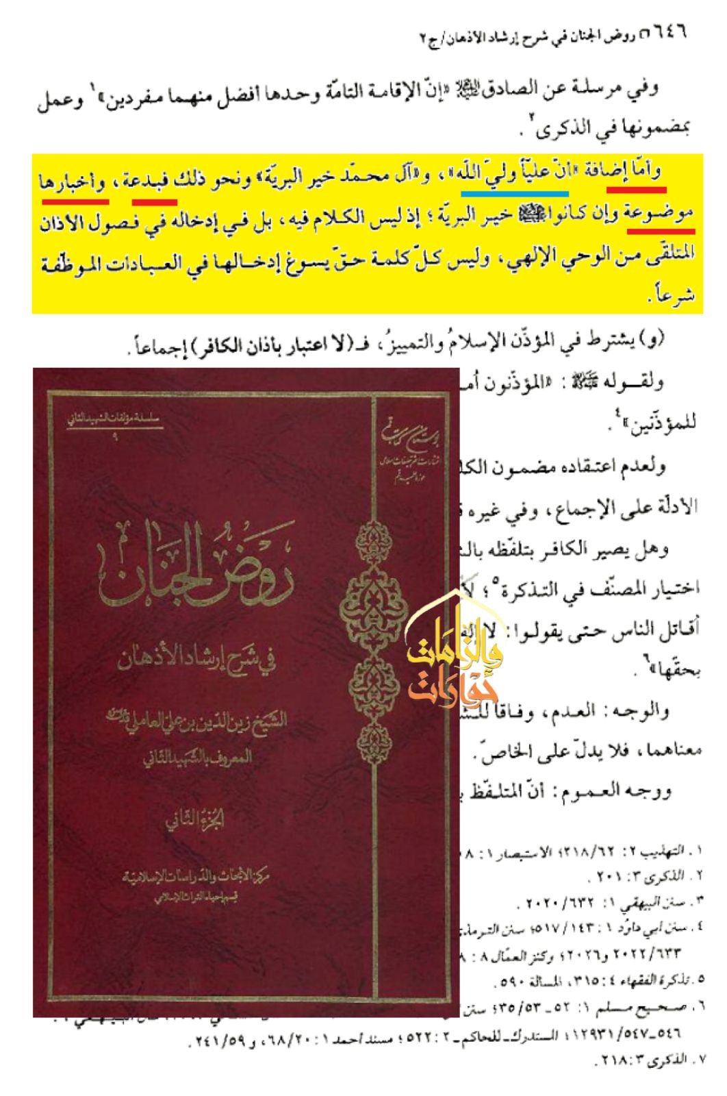 “وبعدَ كلِّ هذا، فإنَّ علماءَ الشيعةِ قد اختلفوا في سُنِّيَّةِ هذه الشهادةِ الثالثةِ أو بِدعيَّتِها، فالأقلُّ القليلُ قال بأنَّها سُنَّةٌ، وهؤلاءِ أكثرُهم من المتأثِّرين، وأمّا جمهورُ الشيعةِ فقد قالوا بِبِدعيَّةِ هذه الشهادةِ الثالثةِ في الأذانِ، وإليكَ الوثائقَ التي تُثبِتُ تناقضَهم في ذلك: