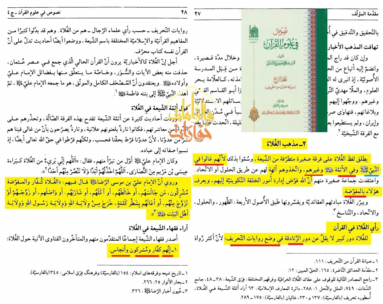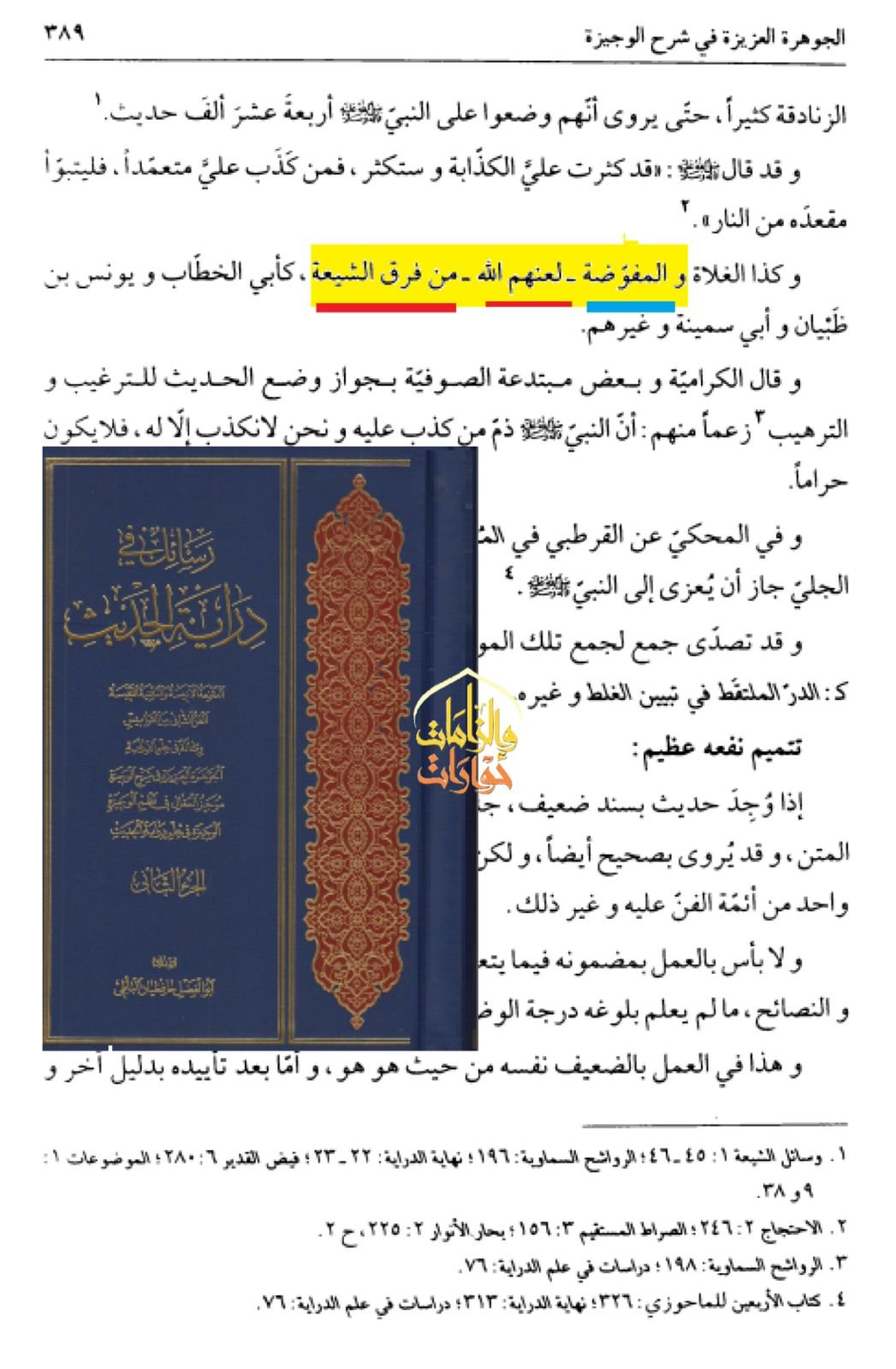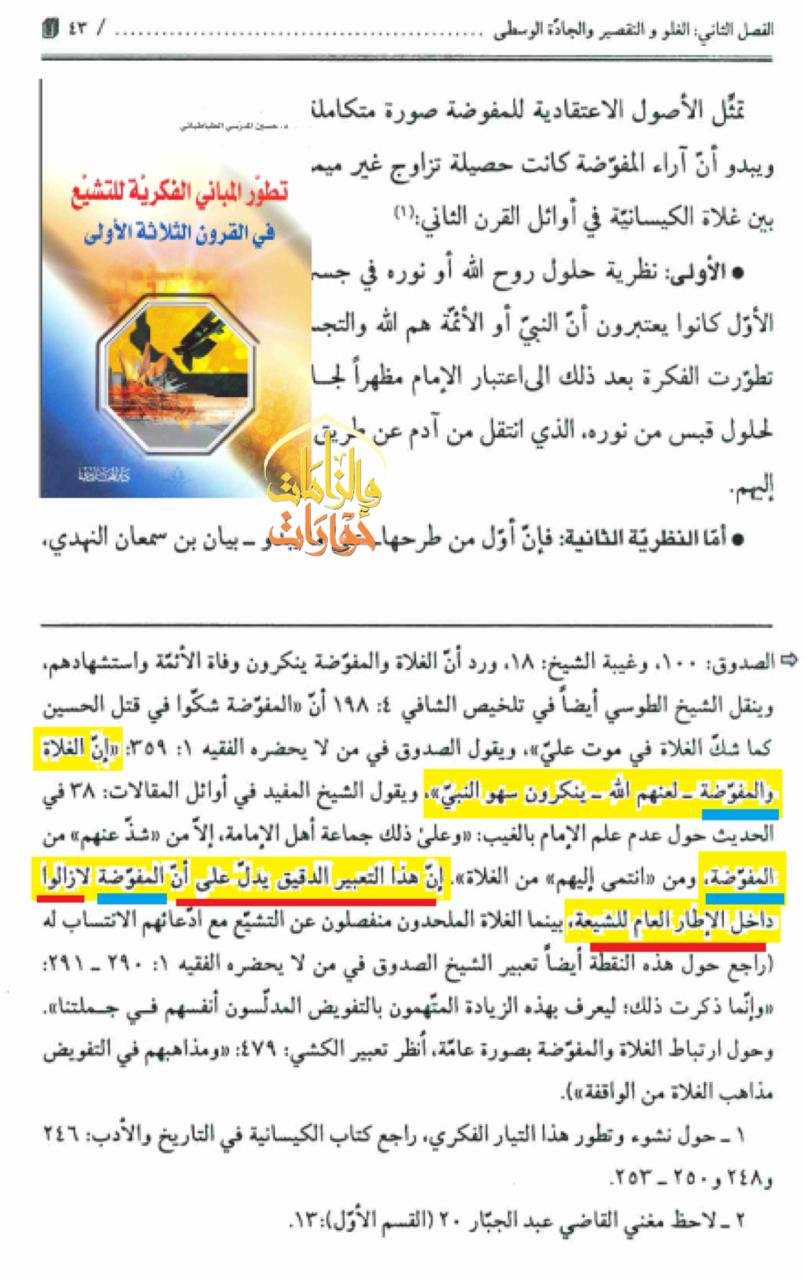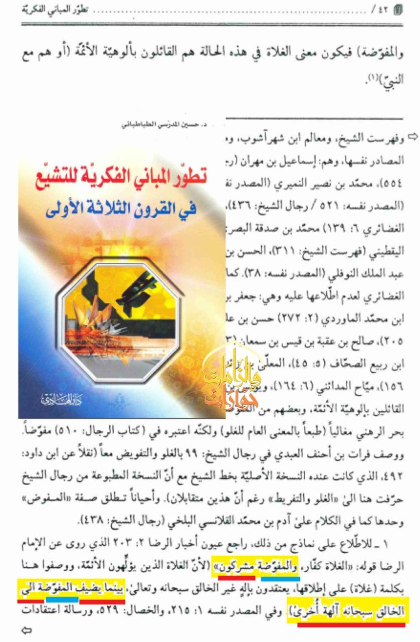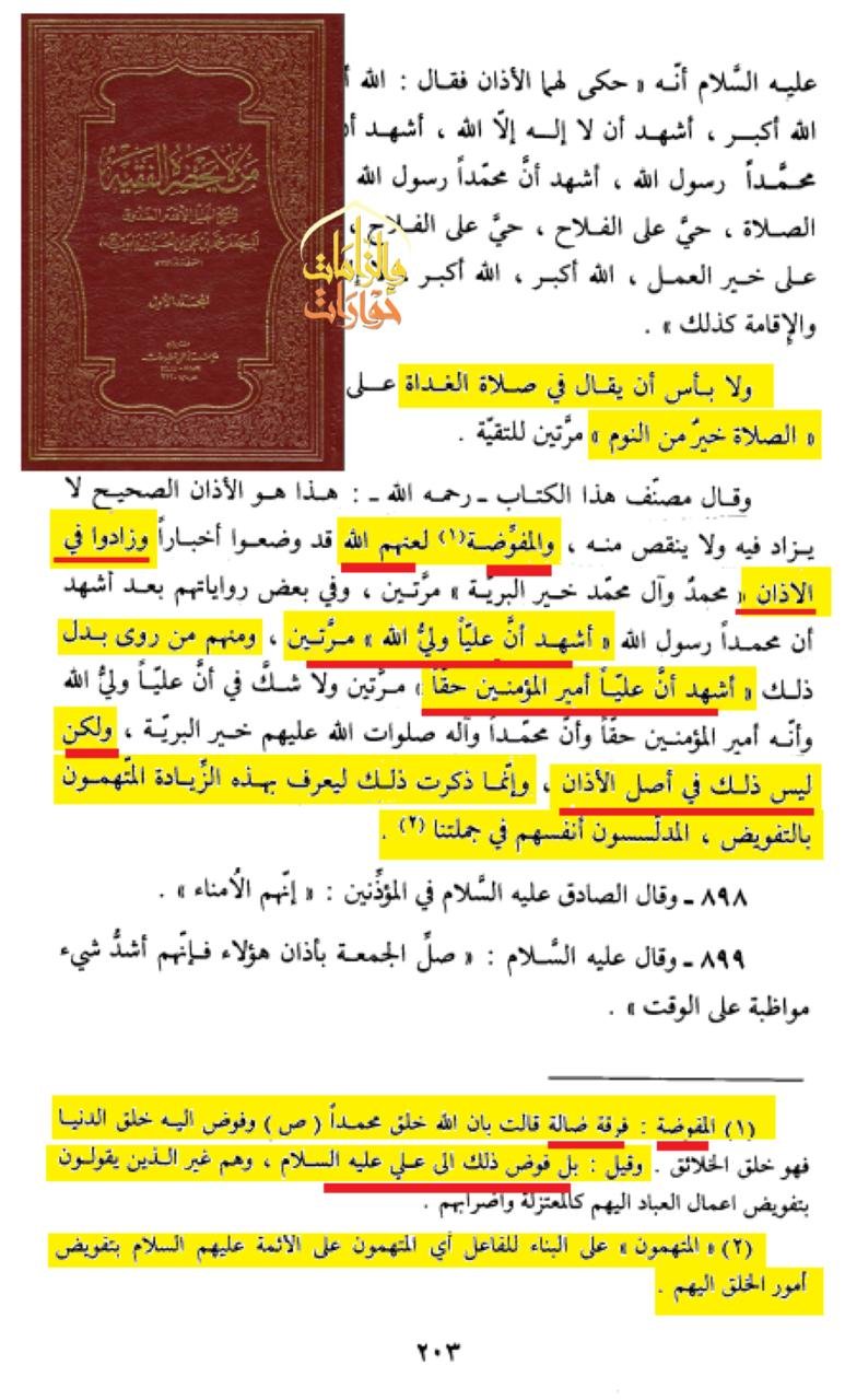 “وبعد أن ثبتَ بأن الشهادةَ الثالثةَ في الأذانِ إنما هي من وضعِ الغُلاةِ والمفوِّضة، فلا بُدَّ من بيانِ حالِ المفوِّضةِ هولاءِ عند الشيعةِ، وهم كُفّارٌ مُشركون.”