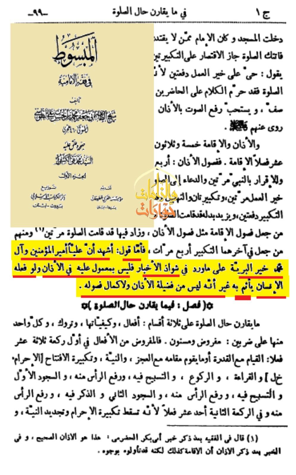 وفي المبسوط : قول : «أشهد أنّ عليّاً أمير المؤمنين عليه‌السلام وآل محمّد خير البريّة» من الشّاذّ لا يعول عليه