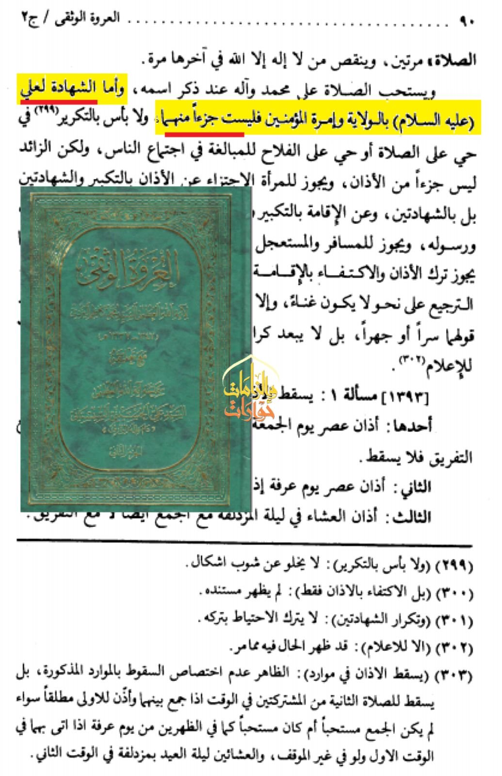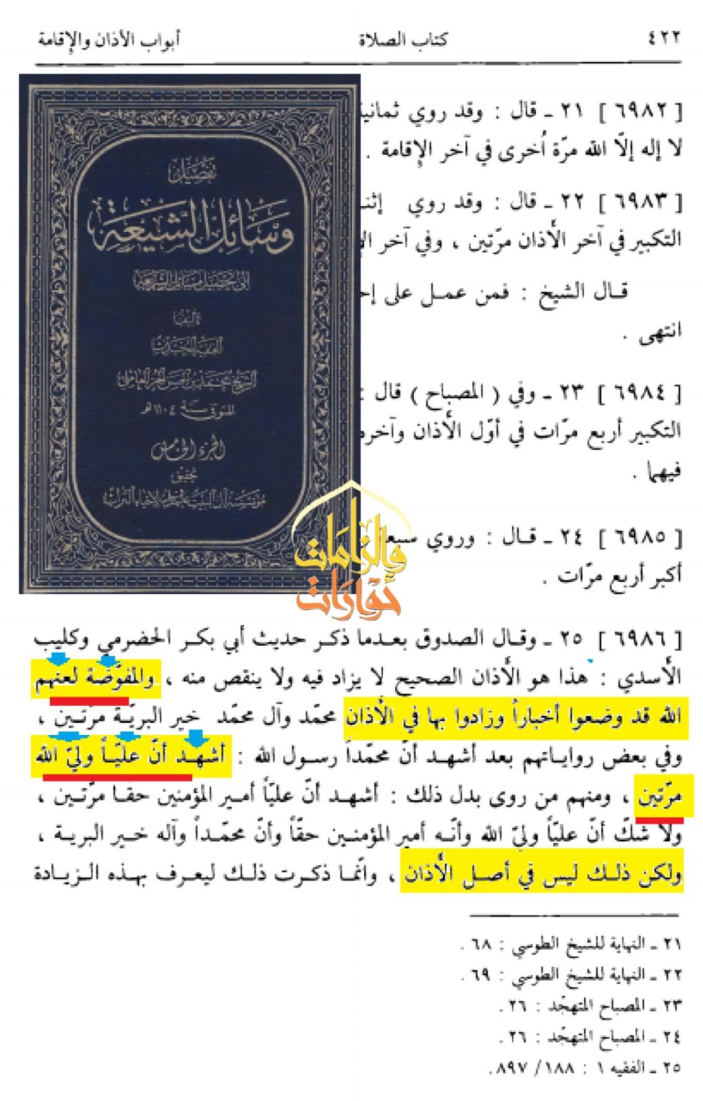 وَلَكِنَّ العَجِيبَ أَنَّ الشِّيَعَةَ قَدِ اتَّفَقُوا عَلَى أَنَّ الشَّهَادَةَ الثَّالِثَةَ فِي الأَذَانِ، وَهِيَ قَوْلُهُ: “أَشْهَدُ أَنَّ عَلِيًّا وَلِيُّ اللَّهِ”، هِيَ مِنَ الأَذَانِ، وَيُسْتَحَبُّ قَوْلُهَا فِي الأَذَانِ، وَهَذَا إِنَّمَا كَانَ فِي الأَزْمِنَةِ المُتَأَخِّرَةِ، وَهُوَ مِنِ ابْتِدَاعِ شُيُوخِهِمْ لَا غَيْرُ ذَلِكَ.