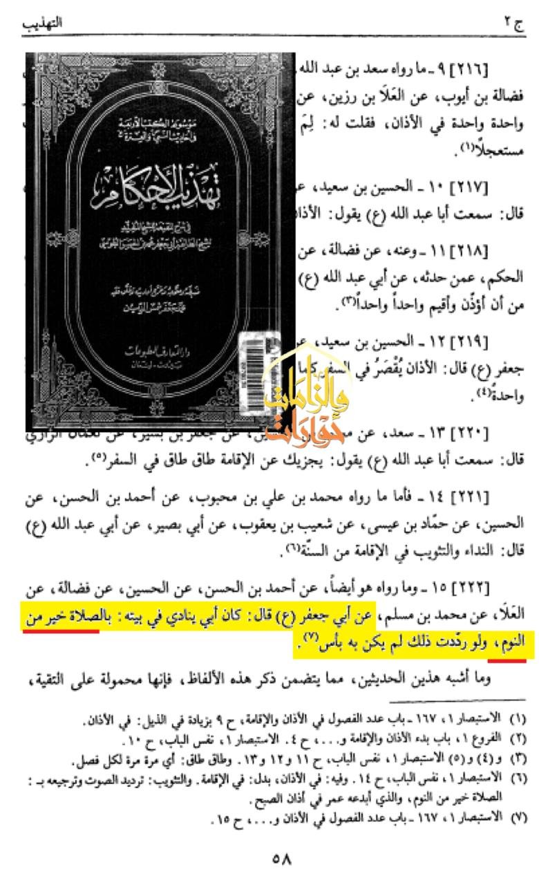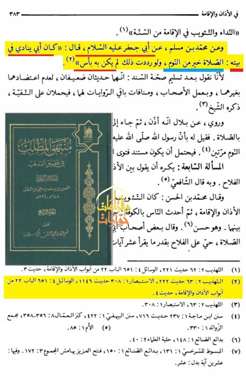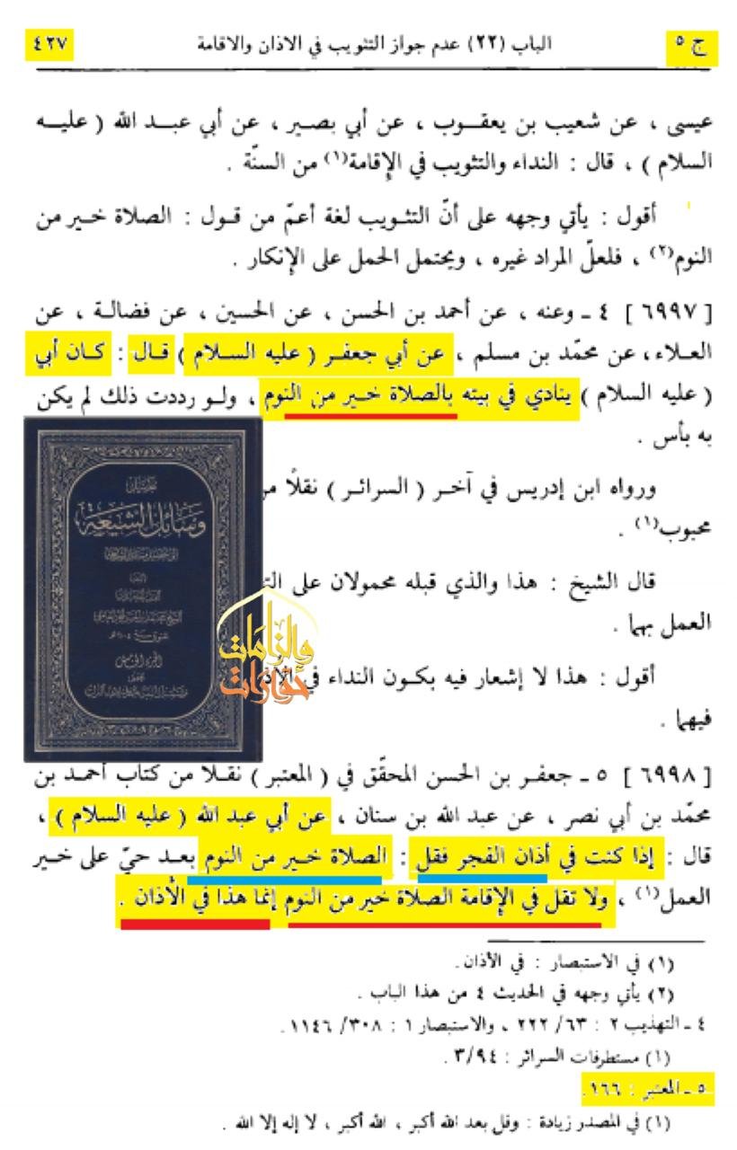 وَقَدْ شَغَبَ الشِّيَعَةُ كَثِيرًا عَلَى أَهْلِ السُّنَّةِ فِي التَّثْوِيبِ فِي الْفَجْرِ، وَالتَّثْوِيبُ هُوَ قَوْلُ الْمُؤَذِّنِ: “الصَّلَاةُ خَيْرٌ مِنَ النَّوْمِ”، وَقَالُوا بِأَنَّ ذَلِكَ بِدْعَةٌ، مَعَ أَنَّ هَذَا اللَّفْظَ قَدْ وَرَدَ فِي كُتُبِهِمْ مَنْصُوصًا عَنْ أَئِمَّتِهِمْ، وَلَكِنَّهُمْ بُغْضًا فِي السُّنَّةِ قَالُوا إِنَّهُ بِدْعَةٌ، وَإِلَيْكَ الْوَثَائِقَ الَّتِي تُثْبِتُ أَنَّ التَّثْوِيبَ إِنَّمَا هُوَ فِعْلُ الْمَعْصُومِ وَسُنَّتُهُ.