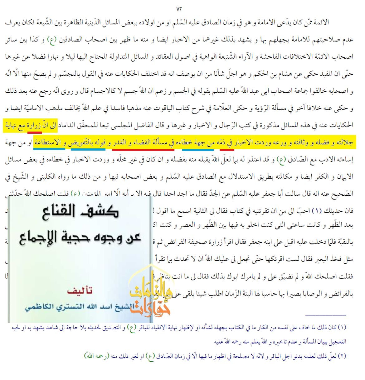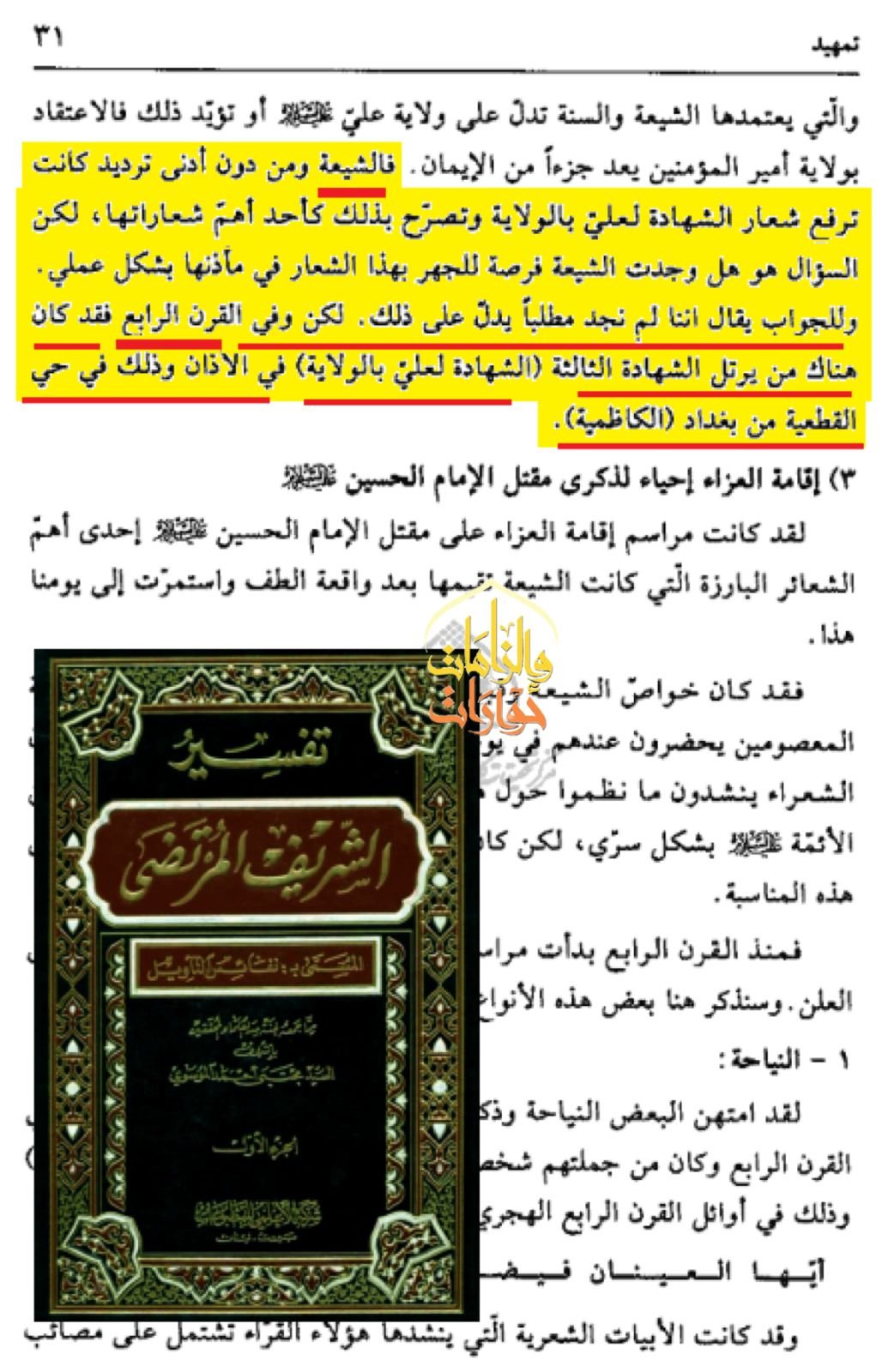“ومعَ أنَّ المُفوِّضةَ الملعونون هؤلاءِ قد ظهروا قديمًا من أمثالِ زرارةَ الذي كان منهم، وكان يَشتِمُ أهلَ البيتِ، إلا أنَّ إظهارَ الشهادةِ الثالثةِ في الأذانِ لم يكنْ إلا في القرنِ الرابعِ الهجريِّ، كما نصَّ على ذلك شريفُهم المُرتضى.”
