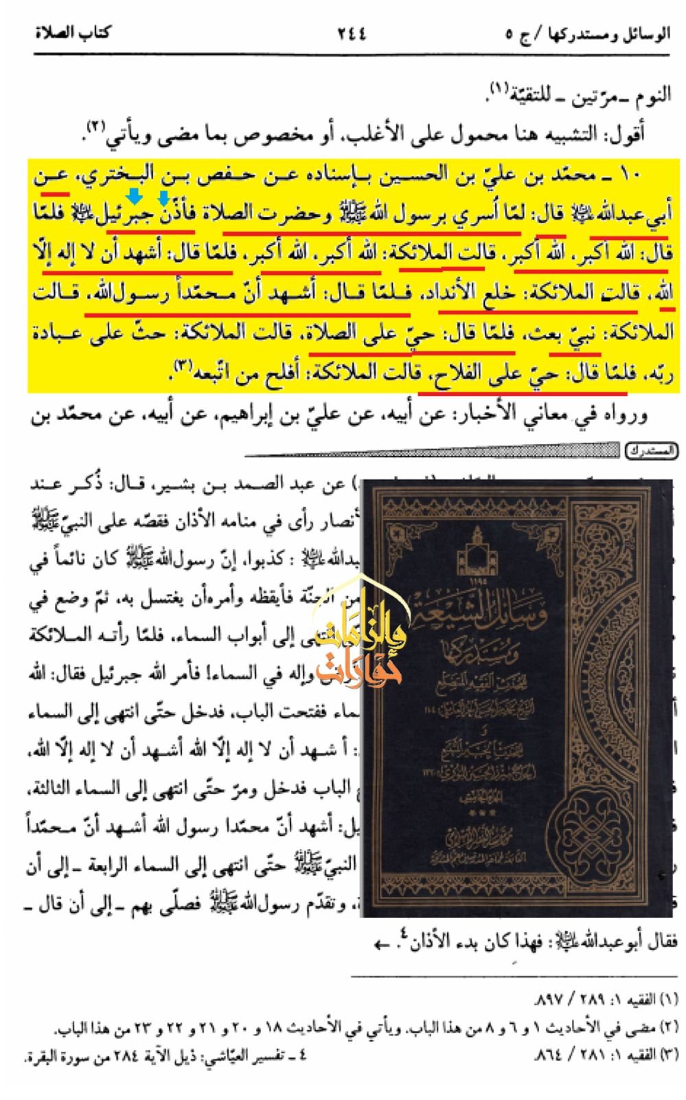 قَدْ ثَبَتَ أنَّ الأذانَ عِبَادَةٌ مِنَ العِبَادَاتِ الَّتي جَاءَتْ بِهَا شَرِيعَةُ الإِسْلَامِ، وَجَاءَ النَّصُّ عَلَى أَلْفَاظِهَا مَعْدُودَةً مِنَ النَّبِيِّ صَلَّى اللهُ عَلَيْهِ وَسَلَّمَ، وَهَذَا مَا ثَبَتَ فِي كُتُبِ الشِّيعَةِ، بِأَنَّ الأَذَانَ عَلَّمَهُ النَّبِيُّ صَلَّى اللهُ عَلَيْهِ وَسَلَّمَ لِعَلِيِّ بْنِ أَبِي طَالِبٍ، وَعَلَّمَهُ عَلِيٌّ بْنُ أَبِي طَالِبٍ لِبِلَالِ بْنِ رَبَاحٍ، فَقَامَ بِلاَلٌ وَأَذَّنَ بِهِ، وَمِنْ تِلْكَ الرِّوَايَاتِ مَا هُوَ مَذْكُورٌ فِي هذِهِ الوَثَائِقِ.