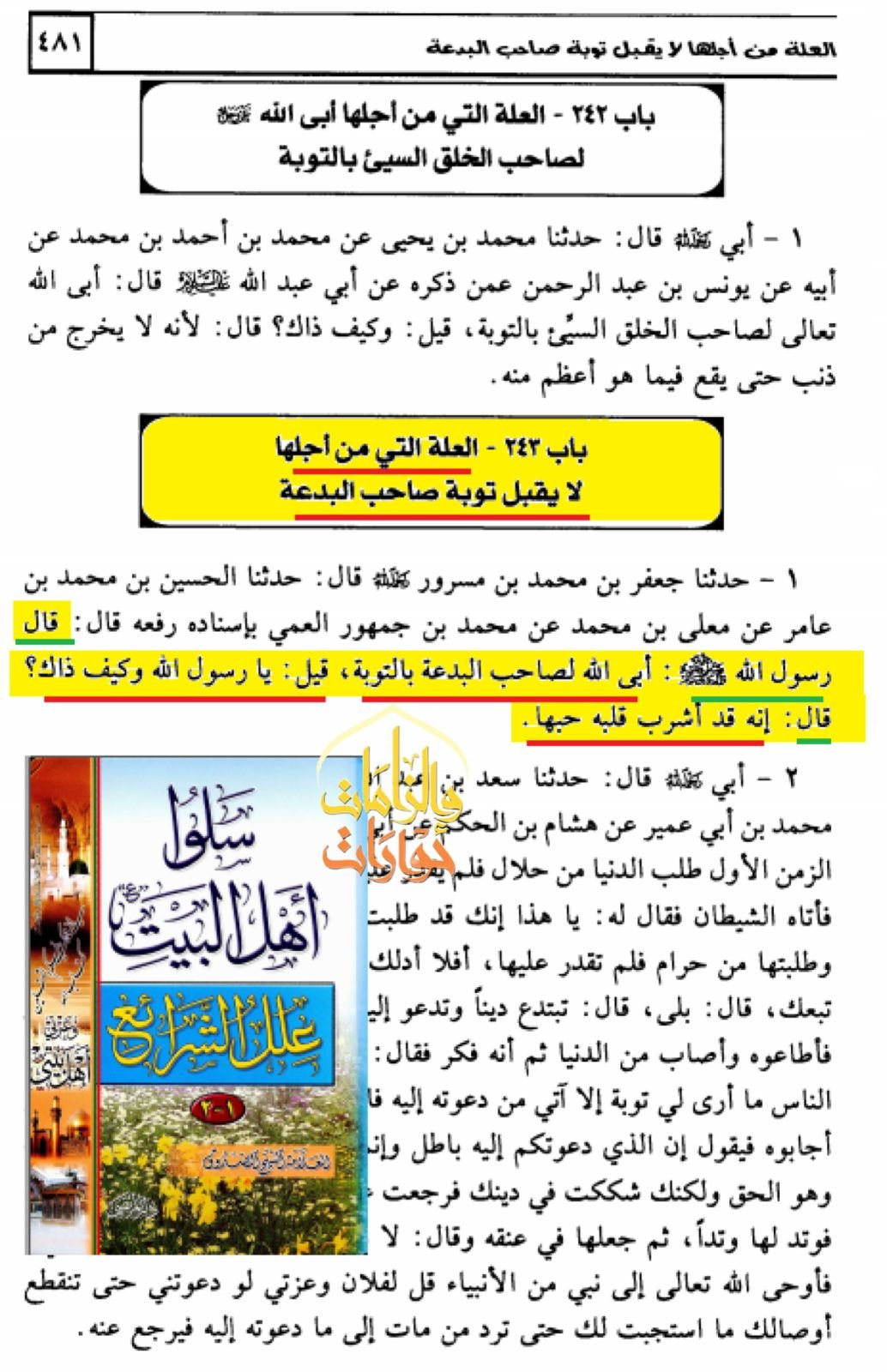 وبناء عليه فإن الشيعة مبتدعة أتباع المفوضعة الذين لعنهم أهل البيت رضي الله عنهم وتوبة المبتدأ عند الشيعة غير مقبولة