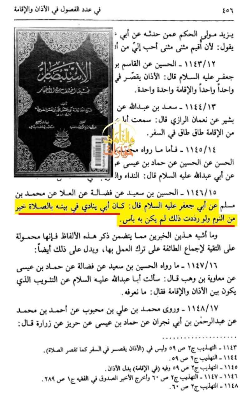 الحسين بن سعيد عن فضالة عن العلا عن محمد بن مسلم عن أبي جعفر عليه السلام قال : كان أبي ينادي في بيته بالصلاة خير من النوم ولو رددت ذلك لم يكن به بأس.