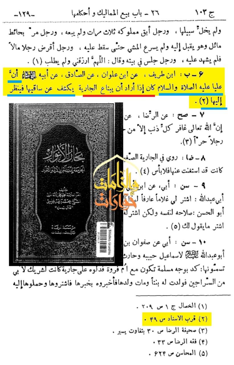٦ ـ ب : ابن طريف ، عن ابن علوان ، عن الصادق ، عن أبيه عليهماالسلام أن عليا عليه الصلاة والسلام كان إذا أراد أن يبتاع الجارية يكشف عن ساقيها فينظر إليها