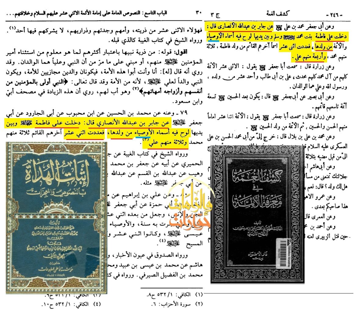 عن جابر بن عبد اللّه الأنصاري قال‌: دخلت على فاطمة عليها السلام و بين يديها لوح فيه أسماء الأوصياء من ولدها، فعددت اثني عشر آخرهم القائم ثلاثة منهم محمد و ثلاثة منهم علي‌