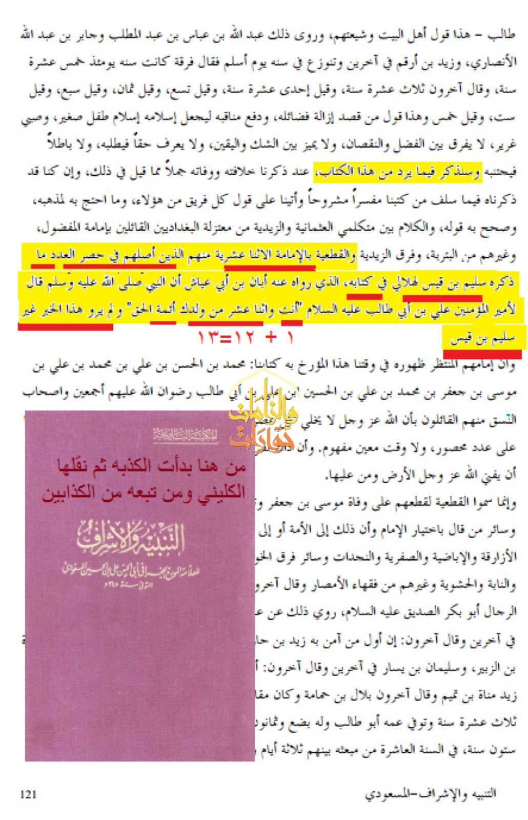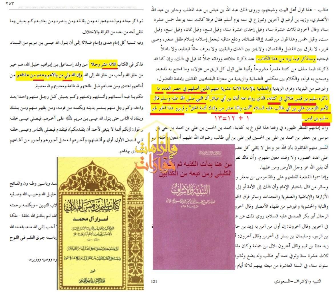 وَرَدَتْ رِوَاياتٌ في أُمَّهَاتِ كُتُبِ الشِّيعةِ تَنْصُّ عَلَى أَنَّ الأَئِمَّةَ ثَلَاثَةَ عَشَرَ إِمَامًا وَلَيْسَ اثْنَيْ عَشَرَ، وَالنُّصُوصُ فِي ذَلِكَ كَثِيرَةٌ وَوَاضِحَةٌ، بَدَأَتْ مِنْ أَقْدَمِ كِتَابٍ عِنْدَ الشِّيعةِ وَهُوَ كِتَابُ سُلَيْمِ بْنِ قَيْسٍ إِلَى كِتَابِ الْكَافِي ثُمَّ كُتُبِ الصَّدُوقِ وَغَيْرِهِ. ذَكَرُوا بِأَنَّ الأَئِمَّةَ ثَلَاثَةَ عَشَرَ فِي رِوَايَاتِهِمْ، وَبَعْضُ الرِّوَايَاتِ أَوْصَلَتِ الأَئِمَّةَ إِلَى أَرْبَعَةَ عَشَرَ، وَهَذَا مَنْصُوصٌ عَلَيْهِ، فَضْلًا عَنْ أَنَّهُ فَهْمُ عُلَمَائِهِمْ وَإِقْرَارُ عُلَمَائِهِمْ بِأَنَّ الرِّوَايَاتِ قَدْ نَصَّتْ عَلَى ذَلِكَ صَرَاحَةً، وَإِلَيْكَ الْوَثَائِقُ الَّتِي تُثْبِتُ ذَلِكَ.