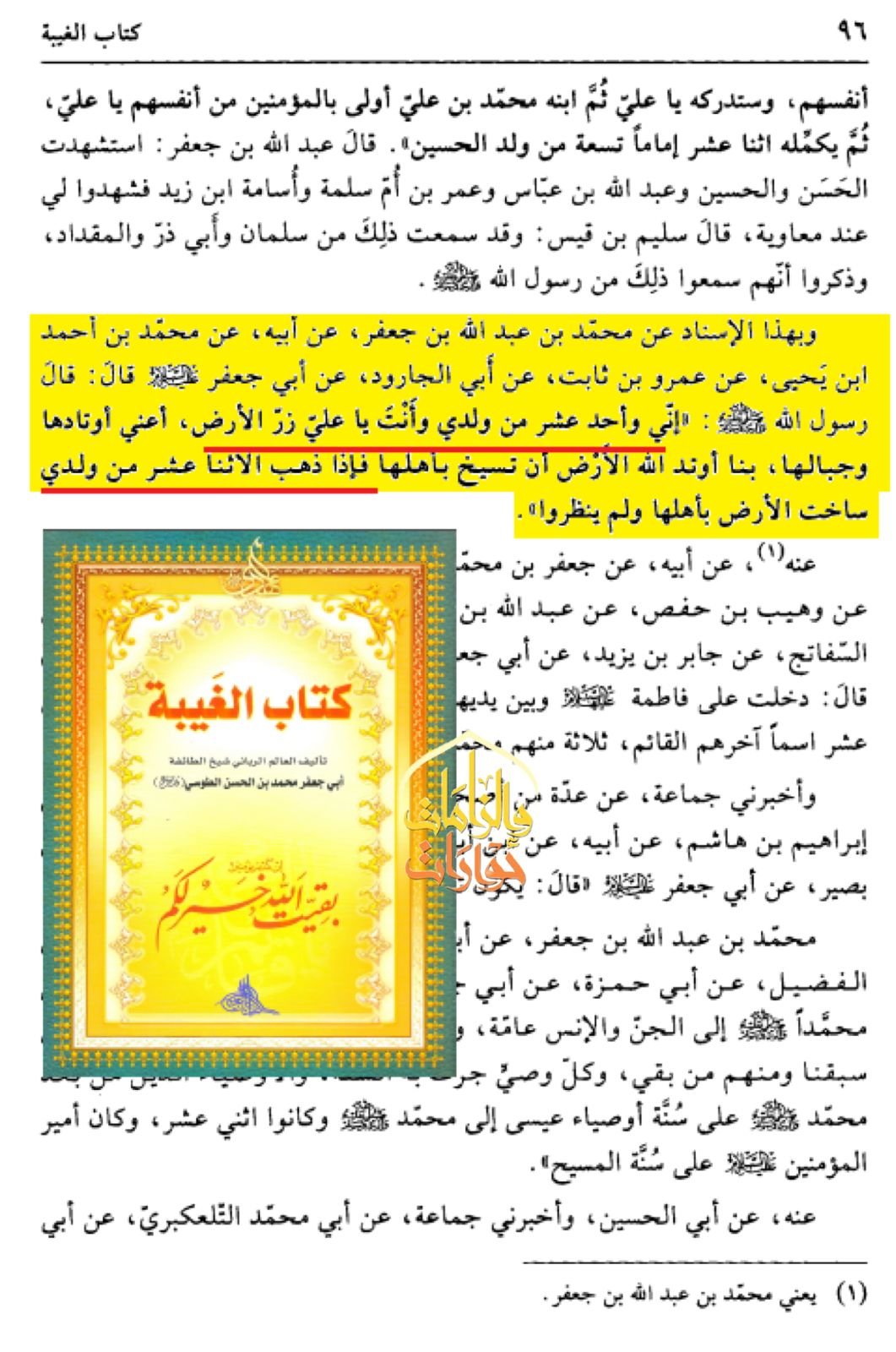 إني وأحد عشر من ولدي وأنت يا علي زر الأرض – أعني أوتادها وجبالها – بنا أوتد الله الأرض أن تسيخ بأهلها، فإذا ذهب الاثنا عشر من ولدي ساخت الأرض بأهلها ولم ينظروا