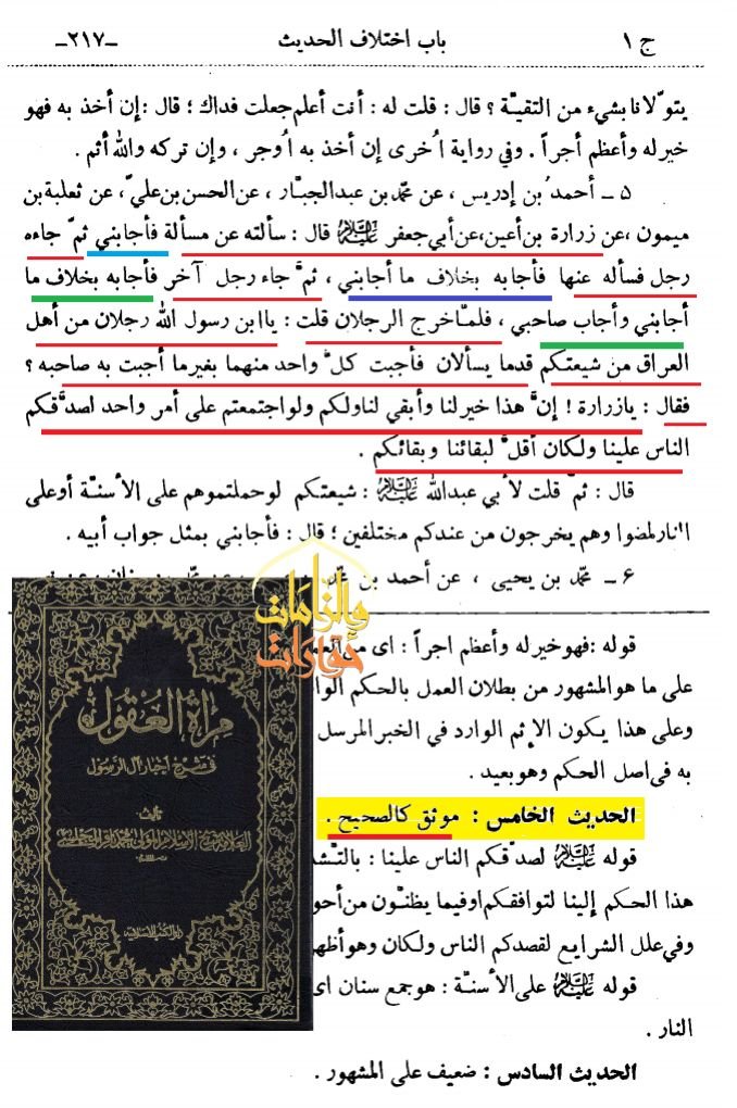 ويقول علامتهم المجلسي في كتاب مرآة العقول في شرح أخبار آل الرسول ج9 ص185: