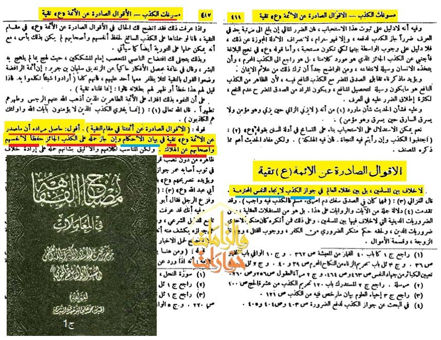 ويقول أيضا:”قوله: الاقوال الصادرة عن ائمتنا في مقام التقية. أقول: حاصل مراده ان ما صدر عن الائمة (عليهم السلام) تقية في بيان الاحكام وان جاز حمله على الكذب الجائز حفظا لانفسهم واصحابهم عن الهلاك”.