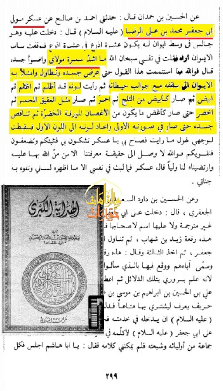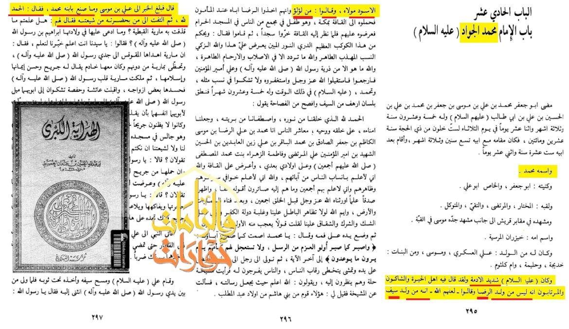 ويقول شيخهم الخصيبي فى كتاب الهداية الكبرى ج1:وَ كَانَ (عليه السلام) شَدِيدَ الْأُدْمَةِ وَ لَقَدْ قَالَ فِيهِ أَهْلُ الْحَيْرَةِ وَ الشَّاكُّونَ وَ الْمُرْتَابُونَ إِنَّهُ لَيْسَ مِنْ وُلْدِ الرِّضَا وَ قَالُوا- لَعَنَهُمُ اللَّهُ- إِنَّهُ مِنْ وُلْدِ سَيْفٍاسم الکتاب : الهداية الكبرى المؤلف : الخصيبي، حسين بن حمدان الجزء : 1 صفحة : 295