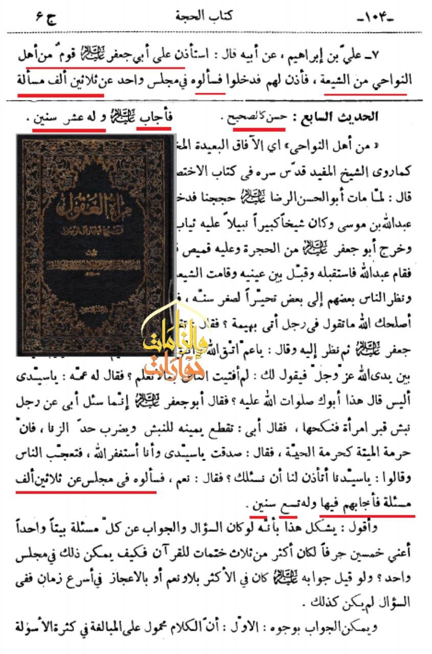 استأذن على أبي جعفر عليهالسلام قوم من أهل النواحي من الشيعة فأذن لهم فدخلوا فسألوه في مجلس واحد عن ثلاثين ألف مسألة