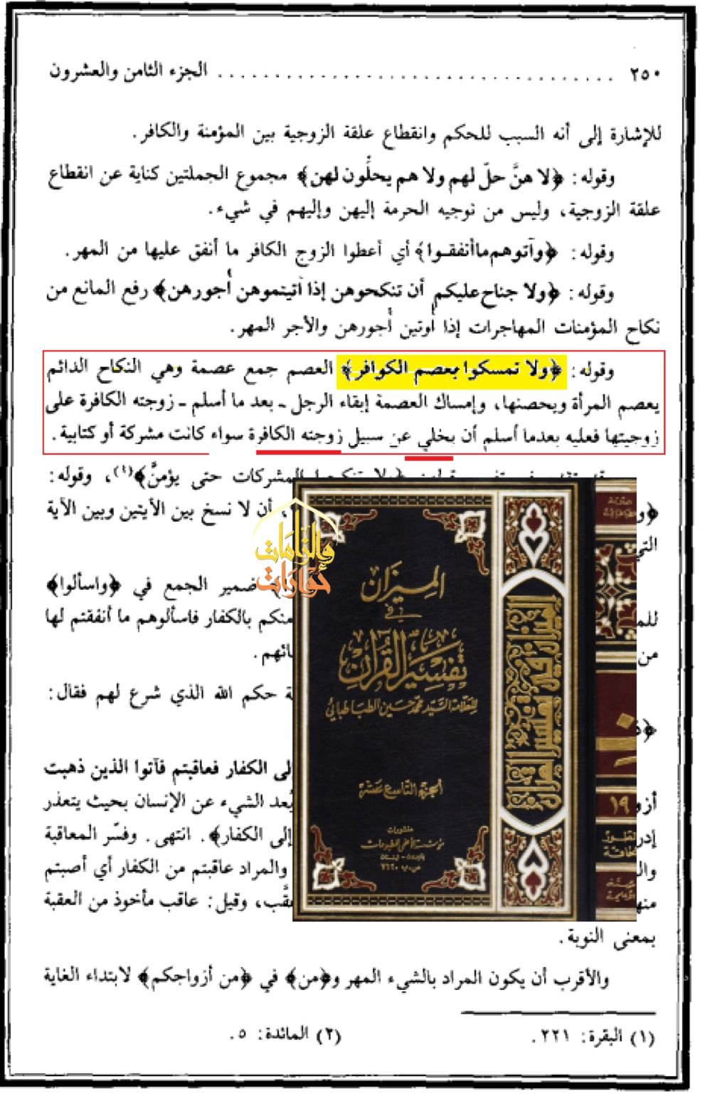 وقوله« وَلا تُمْسِكُوا بِعِصَمِ الْكَوافِرِ » العصم جمع عصمة وهي النكاح الدائم يعصم المرأة ويحصنها ، وإمساك العصمة إبقاء الرجل ـ بعد ما أسلم ـ زوجته الكافرة على زوجيتها فعليه بعد ما أسلم أن يخلي عن سبيل زوجته الكافرة سواء كانت مشركة أو كتابية.