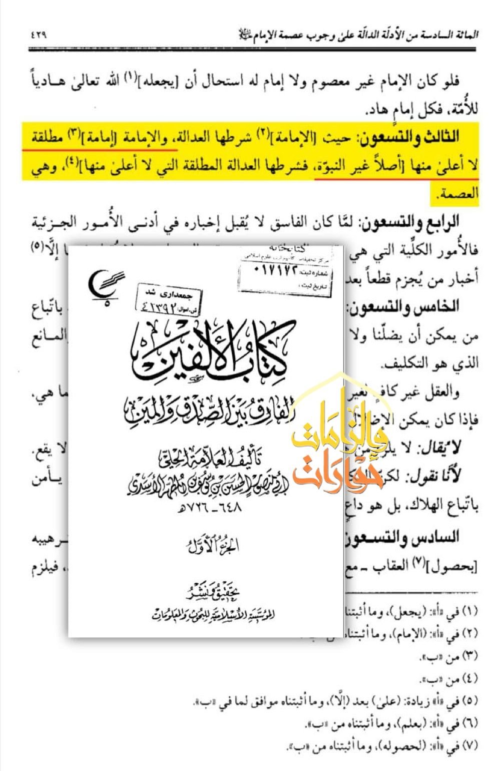 الثالث والتسعون: حيث الإمامة شرطها العدالة والإمامة إمامة مطلقة لا أعلى منها أصلا غير النبوة فشرطها العدالة المطلقة التي منها لا أعلى منها وهي العصمة.