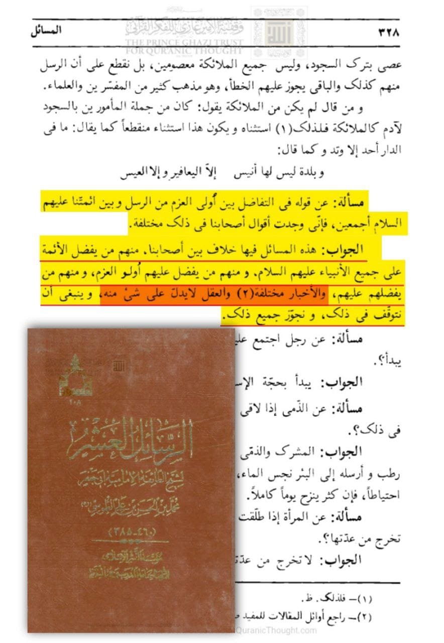 وقد ادعى المجلسي الإجماع على أن أئمتهم أفضل من الأنبياء فقال: وأكثر علماء الامامية بل كلهم قائلون بأن أئمتنا : أفضل من سائر الانبياء سوى نبينا ﷺ”.