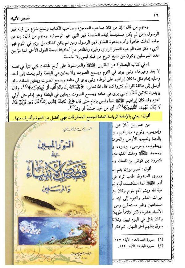 ولكنَّهم تناقضوا في ذلك، فقالوا بأنَّ النبوَّة أعلى منزلةً من الإمامة، وقد نصُّوا على ذلك في مصادر كثيرة، منها هذه المصادر،