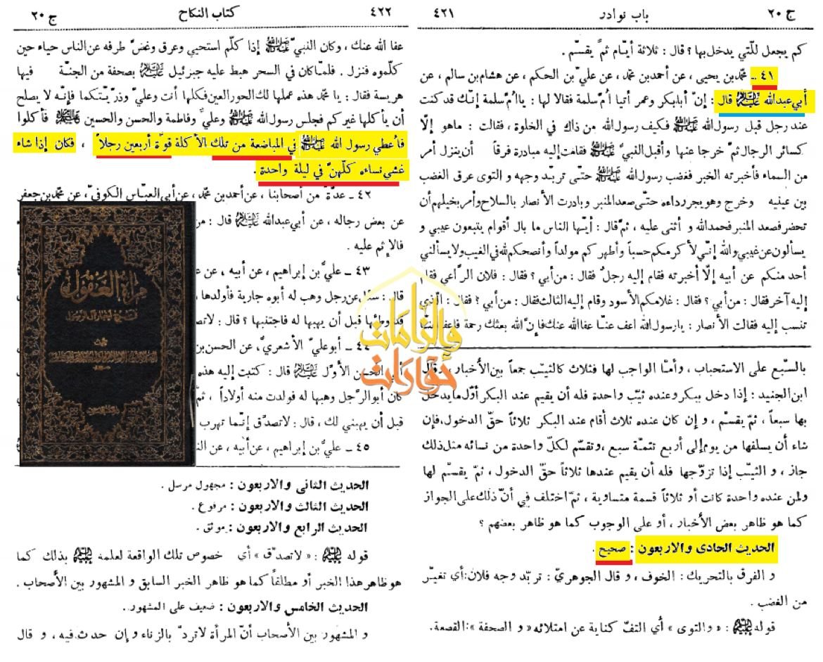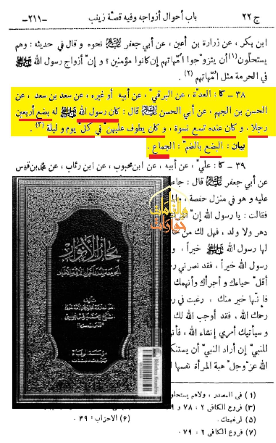 38 – الكافي: العدة، عن البرقي، عن أبيه أو غيره، عن سعد بن سعد، عن الحسن بن الجهم، عن أبي الحسن (عليه السلام) قال: كان رسول الله (صلى الله عليه وآله) له بضع أربعين رجلا، وكان عنده تسع نسوة، وكان يطوف عليهن في كل يوم وليلة (3).