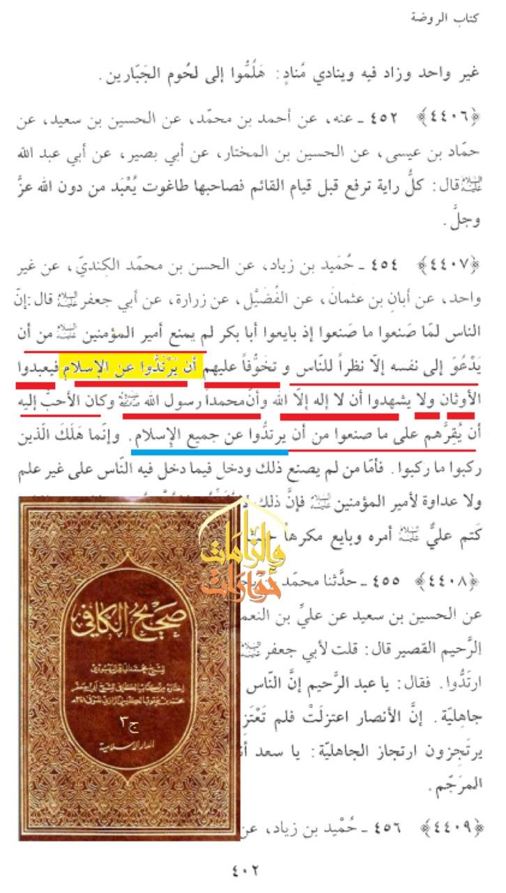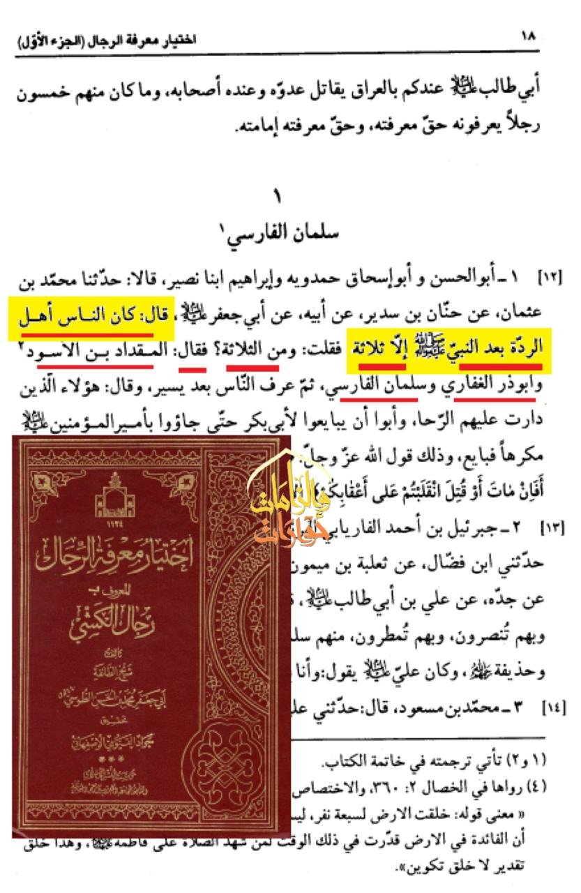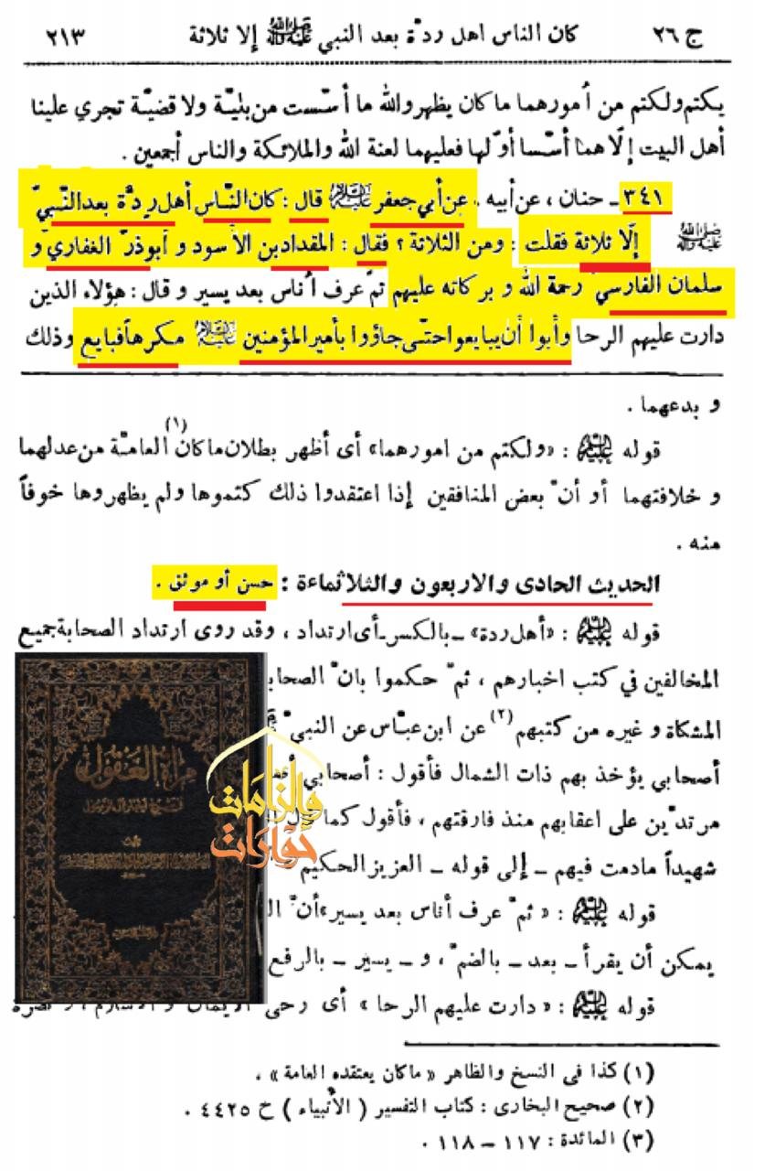 “يَعتَقِدُ الشِّيعةُ بِأَنَّ أَصحابَ النَّبيِّ ﷺ قَدِ ارْتَدُّوا عَنِ الإسلامِ إِلَّا ثَلاثَة، وَإِلَيْكَ الرِّواياتِ فِي ذَلِكَ.”