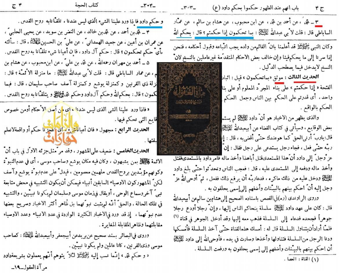 قد قال الشيعة بأن مهديهم إذا خرج فإنه سيحكمه بحكم آل داود لا يسأل بينه ومعلوم من الدين بالضرورة أن النبي صلى الله عليه وسلم إنما كان يحكم بالبيانات والشهود، وهذا دين النبي محمد صلى الله عليه وسلم فإذا عدل عنه المهدي فإنه بذلك قد رغب عن سنة النبي صلى الله عليه وسلم وتركها وذهب إلى ما يشبه صانع الدين الأول وهو ابن سبأ اليهودي من إرادته لتغير دين النبي صلى الله عليه وسلم وهذا يصرحون به في كتبهم وإليك الوثائق