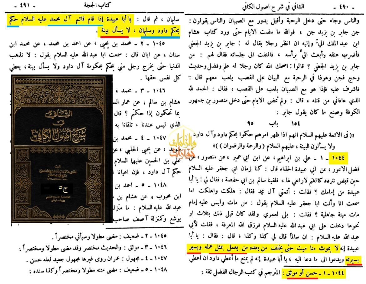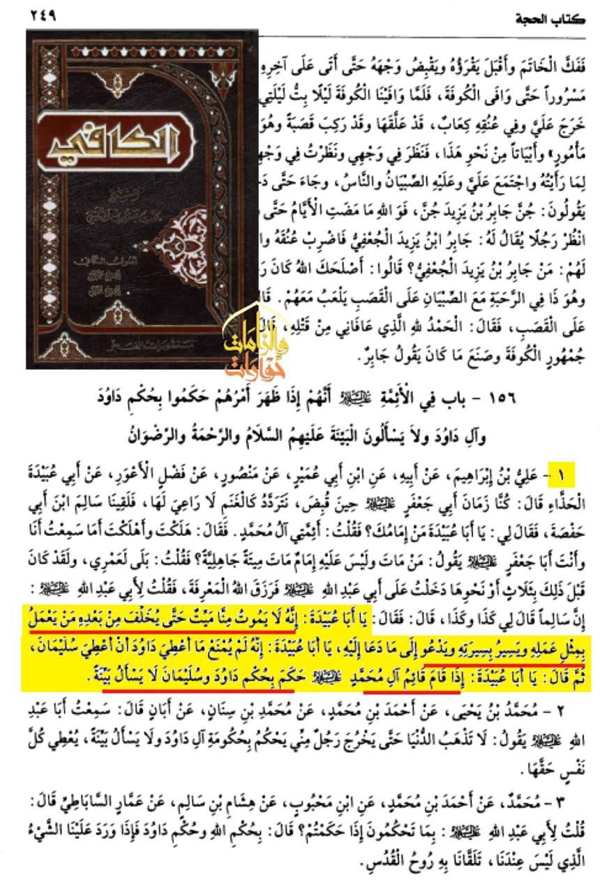 يا أبا عبيدة إنه لا يموت منا ميت حتى يخلف من بعده من يعمل بمثل عمله ويسير بسيرته ويدعو إلى ما دعا إليه يا أبا عبيدة إنه لم يمنع ما أعطي داود أن أعطي سليمان ثم قال يا أبا عبيدة إذا قام قائم آل محمد صلىاللهعليهوآله حكم بحكم داود وسليمان لا يسأل بينة.